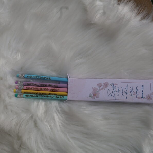 - 5x Personalised Engraved Pencils – Pastel-coloured pencils engraved with motivational Bible verses and/or custom names.
