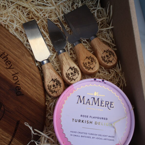 - Cheese Knife Set (x4) – High-quality knives with wooden handles and engraved accents.