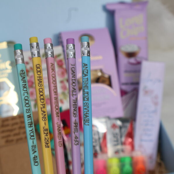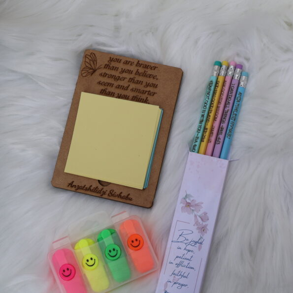 - Pencils Set → 5 motivational pencils with inspiring quotes.